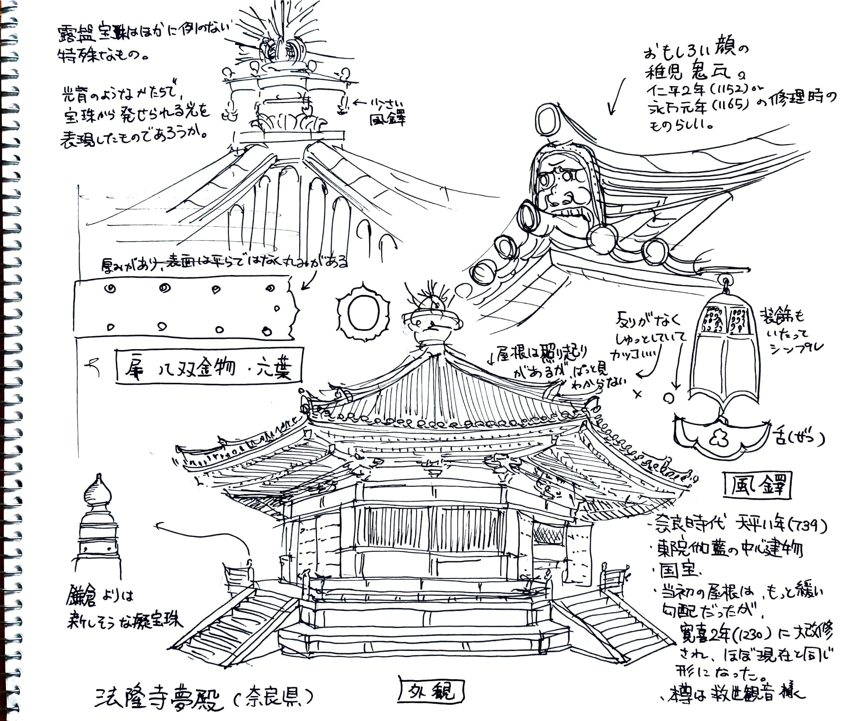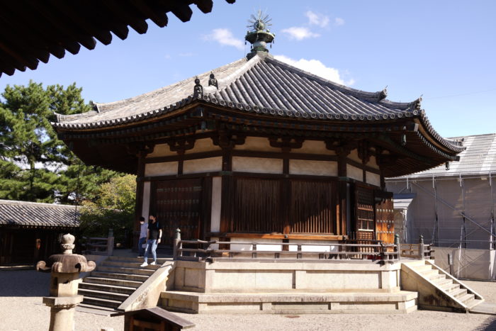 八角形平面の円堂と呼ばれる建物として代表的な建物である。建立は天平であるが、現在の形になったのは、鎌倉時代の大改造を伴う修理の時である。当初の建物は、軸部の高さが少し低く、軒が短く屋根勾配も緩かったらしい。確かに、整った屋根まわりの形は中世的である。