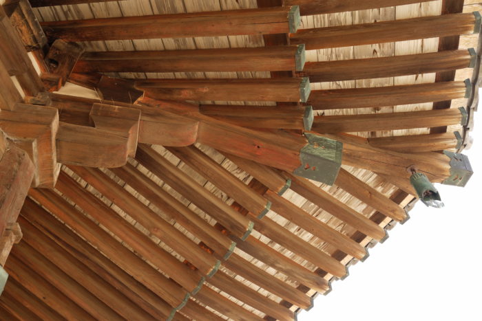 このくらいの規模の建物は軒先の長さが短いので、反り方がよくわかる。中世の頃までは、「心反り」といって、軒先の中央から端部にかけて全体的に反らせてつくられている。大規模な建物では目で見てはっきりとはわかりにくいが、小規模な建物では一目瞭然である。