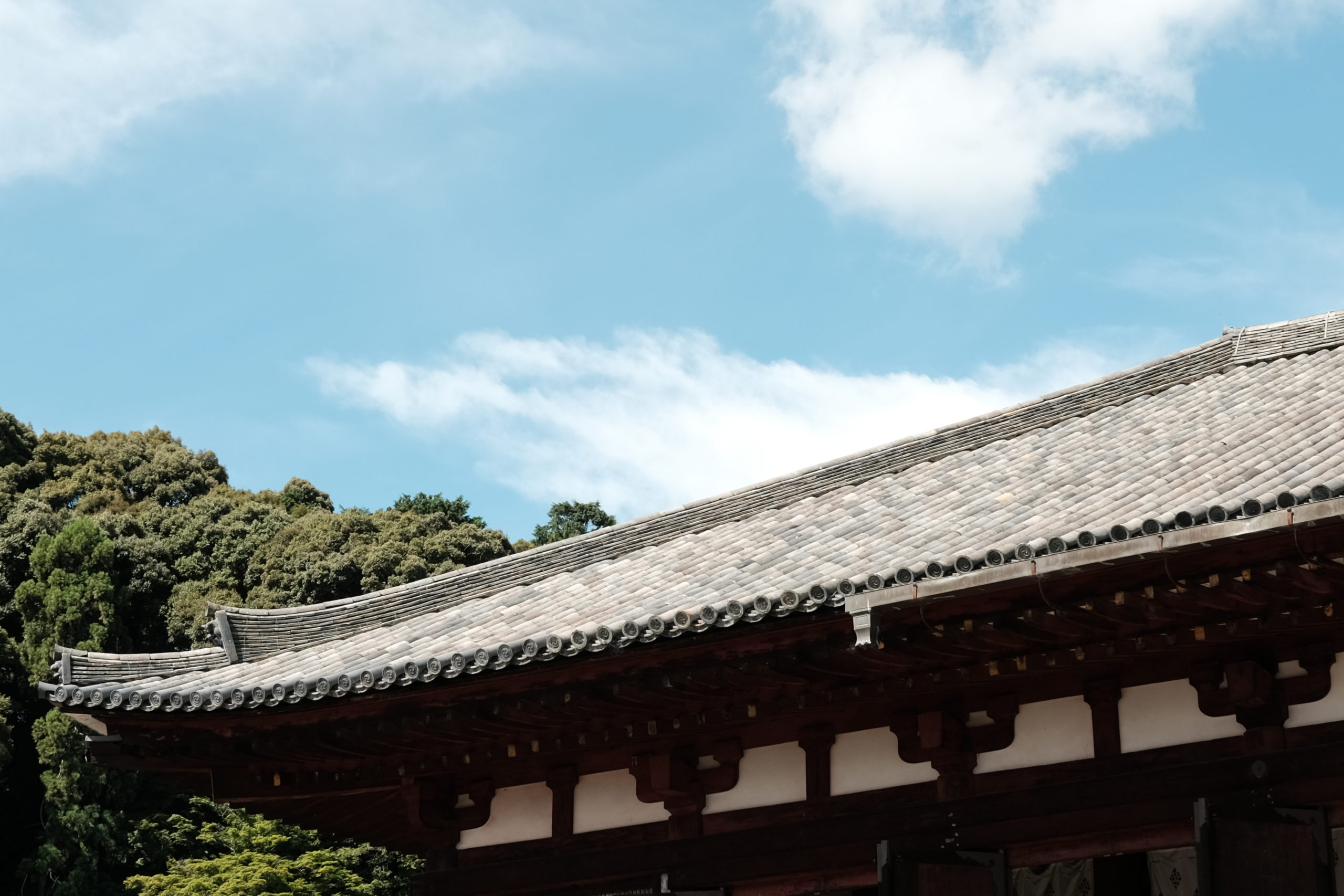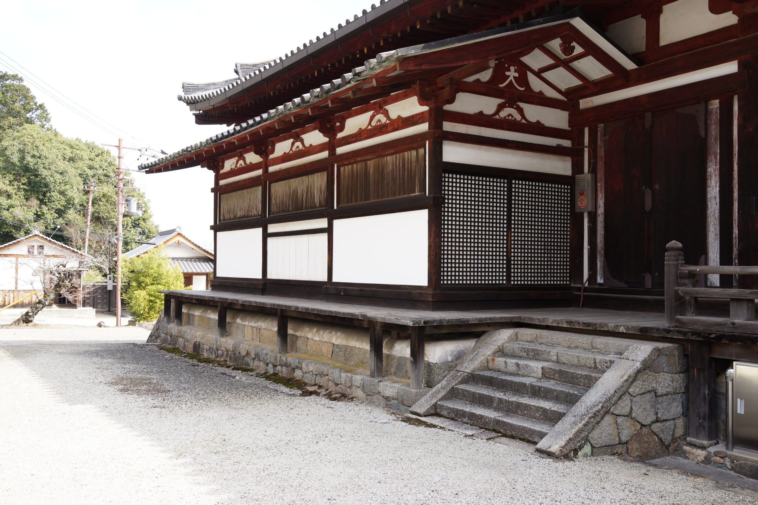 外観はわりとすっきりまとまっている。建物自体が大きいものであるが、かなり高い基壇の上に建ち存在感がある。社寺建築は緩やかな傾斜地に建つことが多いため、背面より正面の基壇が高くなることも多いが、當麻寺はそれにしても高い。背面も高い。石階段7段くらいはあった気がする。繊細な曼荼羅を守るためだろうか。