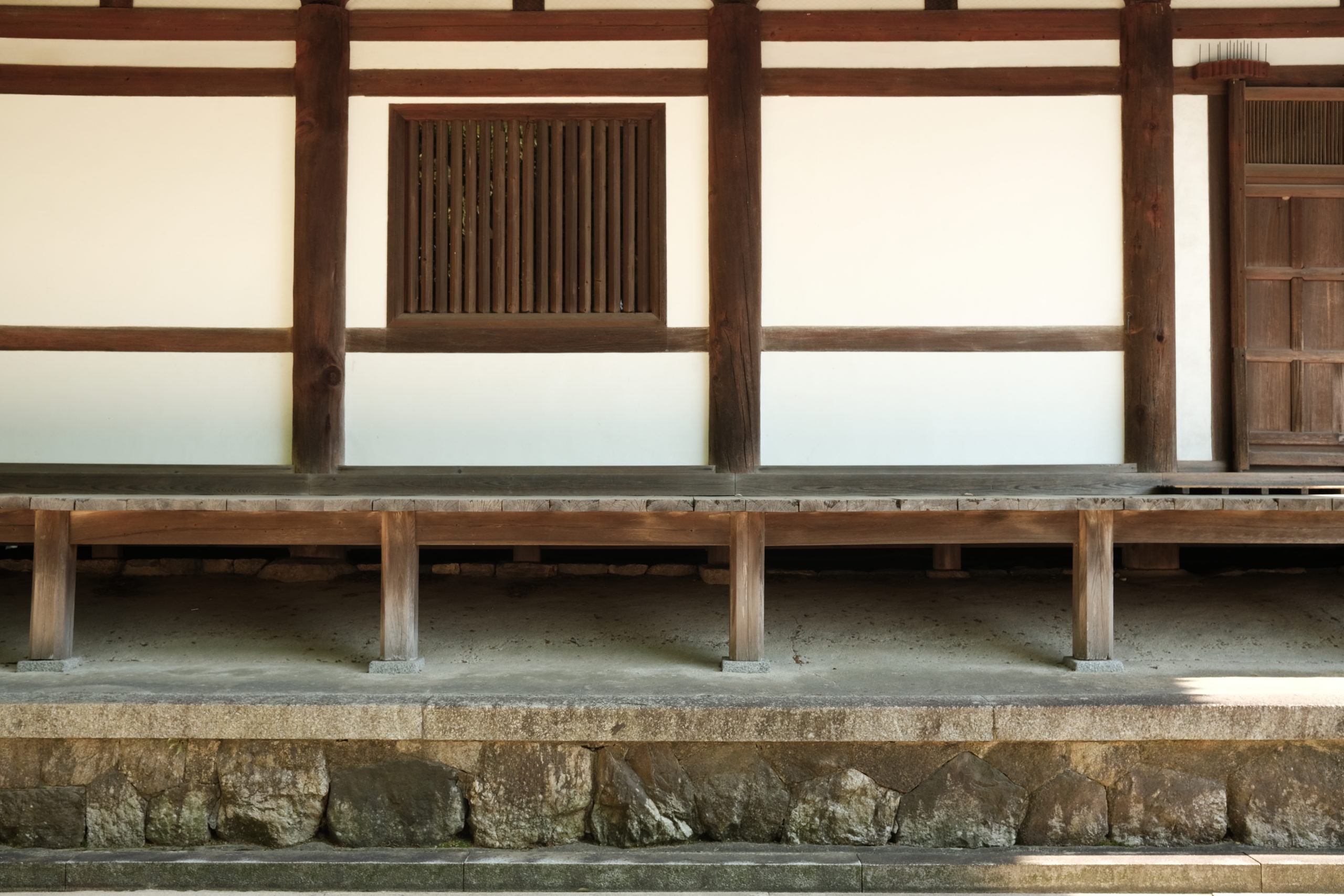 東院堂は、身舎に4面庇がまわるという至ってシンプルで、オーソドックスなもの。向拝も外陣もないので、横長の平面である。内部にはいっさい壁がなく広々としている。その中心に須弥壇が置かれ、聖観音菩薩立像が祀られる厨子が乗っている。厨子の扉はいつでも開かれており、いつでもご本尊の姿を拝むことができる。古い形の仏堂にしては、明るい空間であると感じる。前の扉があけ放たれ側面の一番前の扉もあいていて、風がよく抜ける印象だ。中世の仏堂というと、密教とともに発展してきた印象がつよい。密教建築は、中が暗く、一般の人が入れる外陣は仏様のおられる内陣と結界(菱格子など)で仕切られる。外陣からは内陣の様子がよく見えないようになっていて、神秘的な演出がなされている。それに対して、東院堂は、開放的で神秘的とは少し違う印象をうける。もう少し、親しみやすい感じがする。建立当初にそのようなことが狙って設計されたわけではないかもしれないが、いろいろな形式が整理されて系統立てられた現在では、相対的に見てそのように感じる。